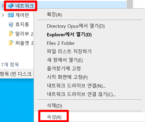 '윈도우 탐색기'에서 '네트워크'에 마우스 포인터를 위치하고 우클릭합니다.