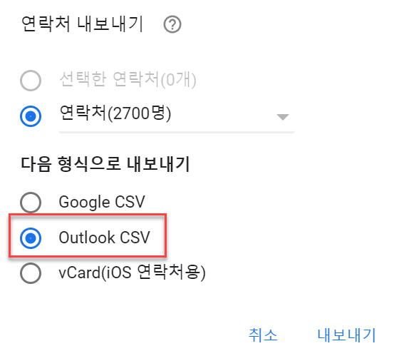 - 구글 주소록으로 이동하여 아웃룩 포멧으로 csv 내보내기 합니다.